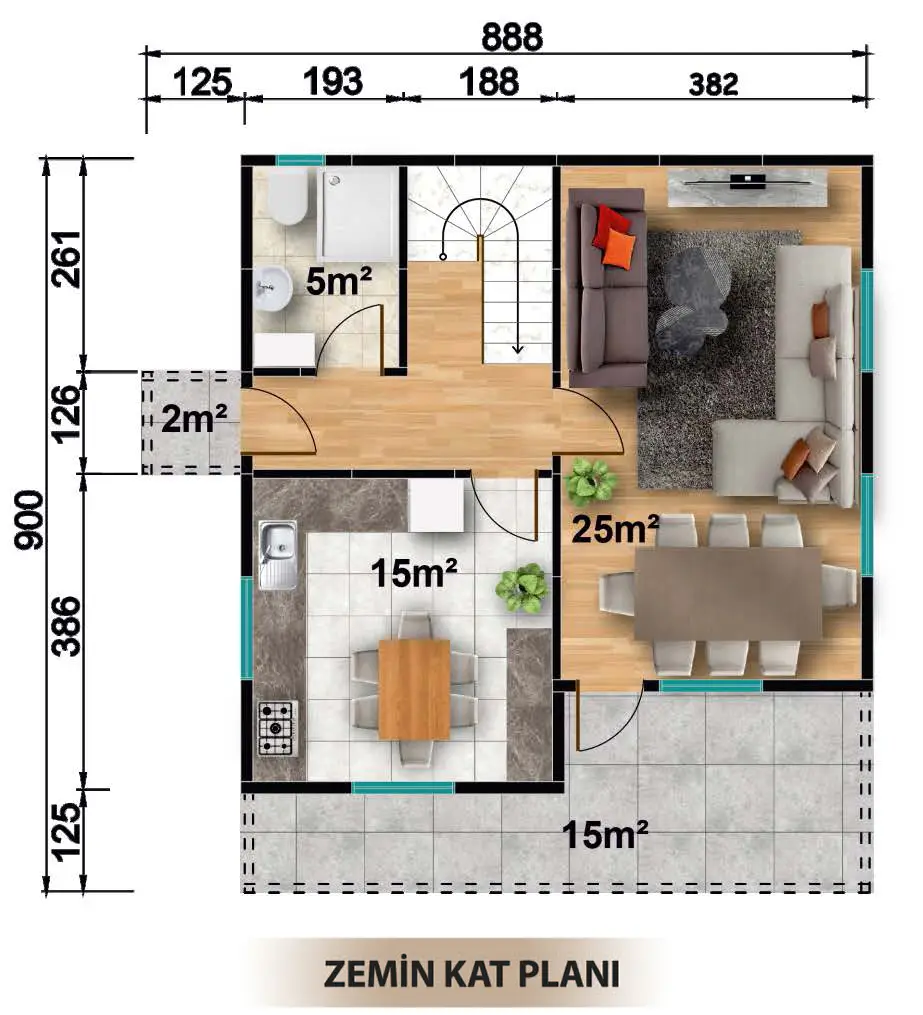 Dış duvarlar ahşap desenli veya taş desenli kaplama